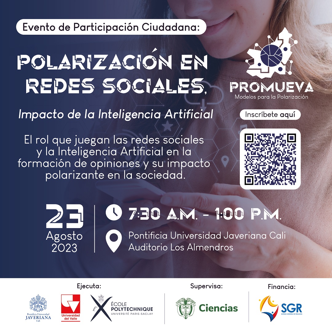 El miércoles 23 de agosto se llevará a cabo en la Pontificia Universidad Javeriana Cali el evento de participación ciudadana “Polarización en Redes Sociales: Impacto de la Inteligencia Artificial”, en el marco del proyecto Polarización en Redes Sociales con un Modelo Unificado para el Valle, PROMUEVA, financiado por el Sistema General de Regalías.