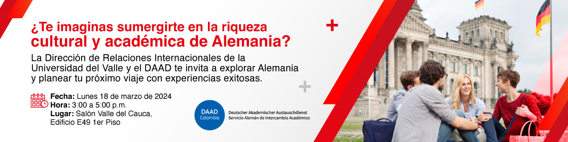 La Dirección de Relaciones Internacionales de la Universidad del Valle y el DAAD te invita a sumergirte en la riqueza cultural y académica de Alemania a través de las charlas del DAAD (Servicio Alemán de Intercambio Académico) y su programa Viajes de Estudios. En este evento, podrás planear tu próximo viaje con oportunidades y experiencias exitosas que te permitirán generar conexiones académicas, crecimiento personal y memorias imborrables en Alemania.