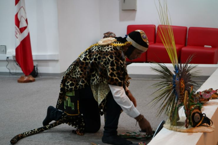 La Vicerrectora de Investigaciones Mónica García Solarte y la profesora Adriana López directora de Relaciones Internacionales asistieron al encuentro, donde Vicerrectora sorprendió a la princesa con un obsequio especial, simbolizando la calidez y hospitalidad de la región. El evento comenzó con la presentación de la obra "Máscara Central Tunguragua", creada por un talentoso profesor de teatro de la sede norte del Cauca Leonardo Abonia Ocampo Licenciado de Artes Escénicas de la Universidad del Valle y miembro del colectivo “yaguarundí” que cautivó a los asistentes con su performance.