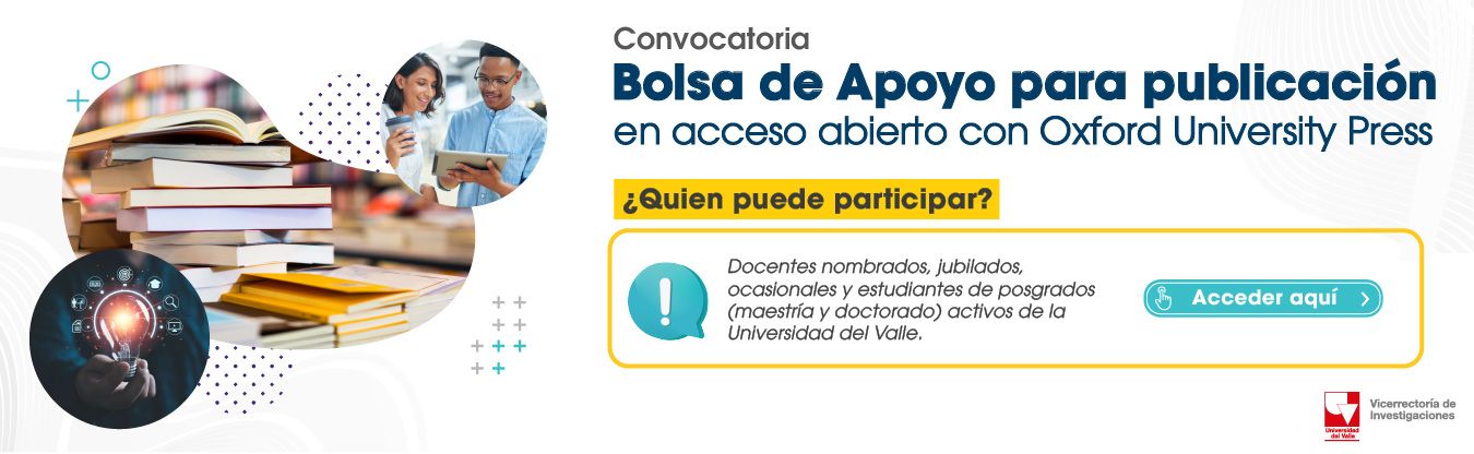La Vicerrectoría de Investigaciones de la Universidad del Valle anuncia con entusiasmo la apertura de la Bolsa de Apoyo para la Publicación de artículos en acceso abierto con la prestigiosa casa editorial Oxford University Press. Esta iniciativa fortalece el compromiso institucional con la visibilidad del conocimiento y la ciencia abierta, facilitando que más investigaciones sean consultadas sin restricciones.
