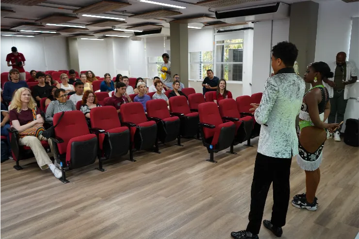 Uno de los momentos más vibrantes de la jornada estuvo a cargo del Área de Cultura, que presentó una demostración de salsa acrobática, un espectáculo lleno de energía que mostró por qué la música y el baile son símbolos profundos de la identidad caleña. Entre giros, acrobacias y sonrisas, los estudiantes internacionales pudieron vivir de primera mano la calidez y el ritmo que caracterizan a la ciudad.