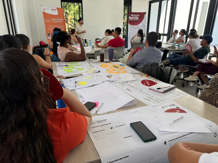 Durante la jornada, estudiantes, docentes, emprendedores y líderes comunitarios participaron en un taller práctico presentado por Natalia Gómez y Alejandra Becerra, gestoras de la Unidad de Innovación Social de la OTRI, quienes introdujeron herramientas como el canvas social.